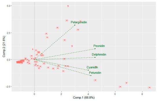 The results of the composition and quantification of anthocyanidins were analyzed to confirm a normal distribution using the Shapiro–Wilk test (α = 0.05). A principal component analysis (PCA) was applied to illustrate the direction of the increase of the variables represented by vectors and their degree of correlation. Kaiser’s criteria followed [57], which retains the main components with values greater than unity. Subsequently, to phenotypically describe the association panel, data were subjected to a hierarchical cluster analysis from the quantitative variables using the farthest neighbor method, which incorporates in the PCA biplot the information of the clusters. The number of groups was determined from the analysis of a dendrogram (Supplementary Material 1), dividing at the level of the different groups with biological importance. Multivariate analysis was performed using the R software [58].