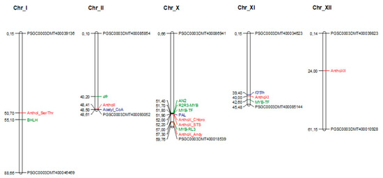 Two significant QTLs associated with the accumulation of cyanidin in potato tubers were located in chromosome I, AnthoI_Ser/Thr. AnthoI_Ser/Thr colocalizes in a gene coding for a serine/threonine-protein phosphatase protein. In addition, the TF MYB, bHLH localized 5 Mbp from the QTL AnthoI_Ser/Thr, which co-regulates the anthocyanin-specific genes together with the AN2 potato locus [72].