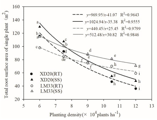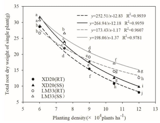 Figure 3, the single root dry weight, root length, and root surface area of the tested varieties decreased as the planting density increased, but the degree of reduction between adjacent densities was different for each variety. For the variety with low tolerance to high planting densities, XD20, the total root dry weight of each plant between adjacent densities decreased by 23.61%, 29.54%, 29.92%, and 25.65%, respectively, and the maximum reduction emerged between D2 and D4. In addition, the root length of each plant decreased by 11.75%, 22.63%, 24.26%, and 25.62%, respectively, and the maximum reduction occurred between D4 and D5. The root surface area of each plant decreased by 20.12%, 18.40%, 38.17%, and 22.44%, respectively, and the maximum reduction occurred between D3 and D4. For the high density-tolerant variety, LM33, the total root dry weight of each plant between adjacent densities decreased by 12.06%, 18.28%, 23.63%, and 13.48%, respectively, and the maximum reduction occurred between D3 and D4. The root length of each plant decreased by 12.15%, 13.19%, 8.40%, and 16.14%, respectively, and the maximum reduction occurred between D4 and D5. The root surface area of each plant decreased by 13.67%, 11.54%, 6.23%, and 15.59%, respectively, and the maximum reduction emerged between D4 and D5. These results indicate that increasing the planting density limited root growth and the development of high-yielding spring maize. Nevertheless, compared with the low density-tolerant variety, the roots of the high density-tolerant variety were less sensitive to high planting densities and maintained better root architecture.