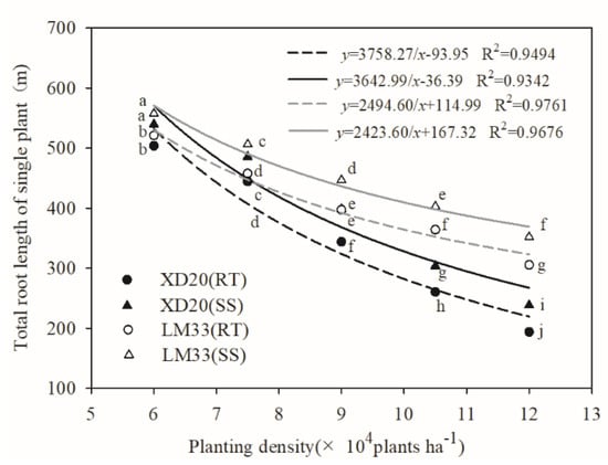 After subsoiling, the total root dry weight of each XD20 plant decreased by 24.12%, 25.92%, 29.00%, and 22.37% between adjacent densities, respectively, and the maximum reduction occurred between D3 and D4. The root length of each plant decreased by 10.03%, 17.88%, 23.88%, and 21.50%, respectively, and the maximum reduction occurred between D3 and D4. The root surface area of each plant decreased by 17.12%, 18.40%, 37.21%, and 13.64%, respectively, and the maximum reduction occurred between D3 and D4. For LM33, the total root dry weight of each plant between adjacent densities decreased by 13.27%, 21.36%, 18.08%, and 14.59%, respectively, and the maximum reduction occurred between D2 and D3. The root length of each plant decreased by 9.21%, 11.73%, 9.87%, and 12.59%, respectively, and the maximum reduction occurred between D4 and D5. The root surface area of each plant decreased by 11.96%, 12.08%, 8.24%, and 13.18%, respectively, and the maximum reduction occurred between D4 and D5. These results indicate that subsoiling tillage significantly alleviated the sensitivity of high-yielding spring maize roots to stress caused by high planting densities by reducing decreases in root dry weight, root length, and root surface area.