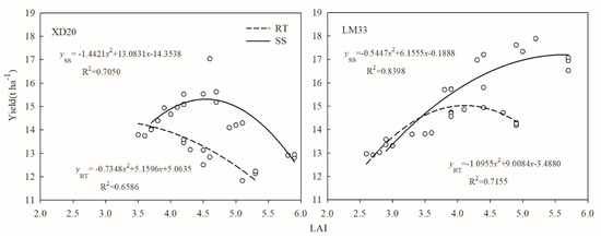 An appropriate LAI can guarantee high maize yields. Therefore, a regression analysis was carried out for the LAI and yield of high-yielding spring maize during the silking stage under different tillage patterns. As shown in