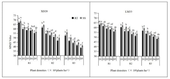Table 3, the LAI of the XD20 improved significantly as the planting density increased during the R1 stage. During the R3 stage, LAI was highest under planting density D2, which was significantly higher than that of D1, D4, and D5. From the R1 to R3 stages, LAI at the different planting densities decreased by 24.07%, 26.67%, 33.85%, 38.97%, and 48.41%, respectively, meaning that the LAI reduction was amplified as planting density increased. Meanwhile, the LAI of the LM33 population increased significantly between the R1 and R3 stages as planting density increased, and the LAI was highest at D5. From R1 to R3, the LAI also decreased as planting density increased by 18.52%, 21.15%, 23.28%, 25.76%, and 28.57%, respectively.