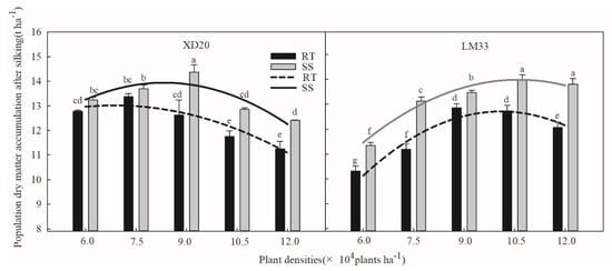 Figure 6, after the silking stage, the accumulation of dry matter in the maize population showed a parabolic relationship with planting density.