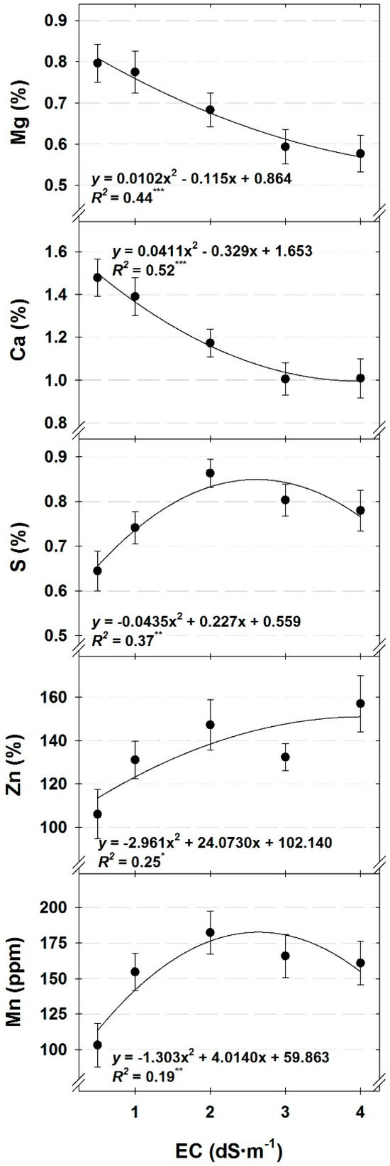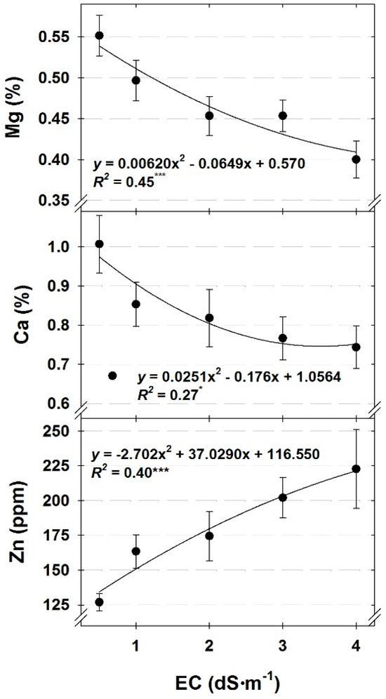 Tissue Mg, Ca, and Zn of cilantro (Coriandrum sativum ‘Santo’) 4 weeks after transplanting into nutrient-film technique hydroponic systems in a greenhouse under a low (~7 mol∙m−2∙d−1) or high (~18 mol∙m−2∙d−1) daily light integral (DLI) with a range of nutrient solution electrical conductivity (EC; 0.5 to 4.0 dS∙m−1) treatments. Data were pooled across daily light integrals within EC. Each symbol represents the mean of six replications with ten plants per replicate, and error bars represent the standard errors of the mean of the six replicates. * or *** indicate significant at p ≤ 0.05 or 0.001, respectively.