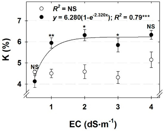 Tissue K of dill (Anethum graveolens ‘Fernleaf’) 4 weeks after transplanting into nutrient-film technique hydroponic systems in a greenhouse under a low (~7 mol∙m−2∙d−1; closed symbol) or high (~18 mol∙m−2∙d−1; open symbol) daily light integral (DLI) with a range of nutrient solution electrical conductivity (EC; 0.5 to 4.0 dS∙m−1) treatments. Each symbol represents the mean of three replications with ten plants per replicate, and error bars represent the standard errors of the mean of the three replicates. NS, *, ** or *** indicate non-significant or significant at p ≤ 0.05, 0.01, or 0.001, respectively.