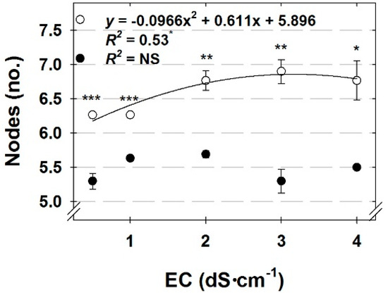 Node number of parsley (Petroselinum crispum ‘Giant of Italy’) 4 weeks after transplanting into nutrient-film technique hydroponic systems in a greenhouse under a low (~7 mol∙m−2∙d−1; closed symbol) or high (~18 mol∙m−2∙d−1; open symbol) daily light integral (DLI) with a range of nutrient solution electrical conductivity (EC; 0.5 to 4.0 dS∙m−1) treatments. Each symbol represents the mean of three replications with ten plants per replicate, and error bars represent the standard errors of the mean of the three replicates. NS or * indicate non-significant or significant at p ≤ 0.05, respectively.