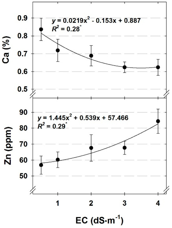 Tissue Ca and Zn of parsley (Petroselinum crispum ‘Giant of Italy’) 4 weeks after transplanting into nutrient-film technique hydroponic systems in a greenhouse under a low (~7 mol∙m−2∙d−1) or high (~18 mol∙m−2∙d−1) daily light integral (DLI) with a range of nutrient solution electrical conductivity (EC; 0.5 to 4.0 dS∙m−1) treatments. Data were pooled across daily light integrals within EC. Each symbol represents the mean of six replications with ten plants per replicate, and error bars represent the standard errors s of the mean of the six replicates. * indicates significant at p ≤ 0.05.