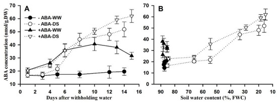 Changes in soil water content over time (days) after withholding water. One day before withholding water, plants were pretreated with (+ABA) or without (−ABA) 10 µM exogenous ABA. Values are the mean ± SE (n = 3).