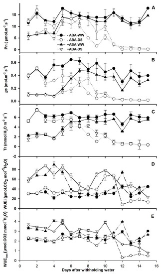 The decrease in gs and leaf transpiration rate, which significantly increased WUEi and WUEinst under well-watered conditions during the first five days after ABA was applied, indicates that exogenous application of ABA can affect the stomatal behavior, increasing both WUEi and WUEinst, as previously showed, but under drought conditions [10,34]. However, the effect of exogenous application of ABA on WUEi and WUEinst under well-watered conditions was transient.