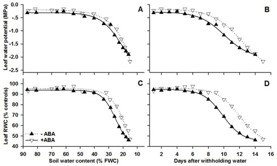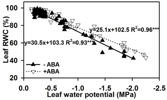 Exogenous applications of ABA improved leaf RWC and maintained leaf photosynthetic rate during the progressive drying of the soil. This is consistent with previous findings that soybean cultivars with high OA have high leaf RWC under water stress [9,15] and indicates that OA plays an important role in maintaining leaf RWC. The exogenous application of ABA could increase leaf ABA accumulation to induce stomata closure and reduce water loss to maintain leaf RWC under water stress. The other way leaf RWC was maintained was by increasing water uptake by the root system from the soil, as the high OA in the leaf allowed a further reduction in Ψleaf.