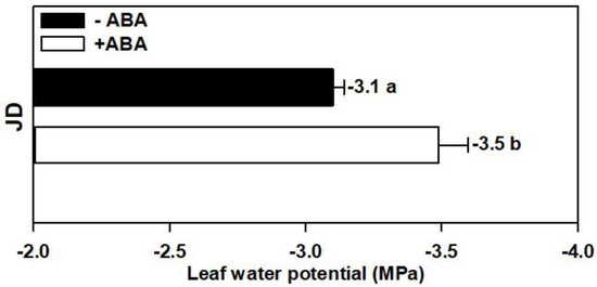 The effect of 10 µM exogenous ABA on lethal leaf water potential of the soybean cultivar Jindou 19 (JD). One day before withholding water, plants were pretreated with (+ABA) or without (−ABA) 10 µM exogenous ABA. Values are means ± SE (n = 6).