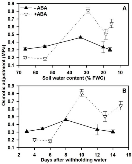 Changes in leaf osmotic adjustment (OA) with soil water content (A) and days after withholding water (B) in the soybean cultivar Jindou 19 (JD). One day before withholding water, plants were pretreated with (+ABA) or without (−ABA) 10 µM exogenous ABA. Values are means ± SE (n = 3).