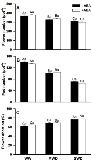 (A) Flower number (pot−1), (B) pod number (pot−1) and (C) flower abortion (%) in the soybean cultivar Jindou 19 (JD)—with and without 10 µM exogenous ABA applied one day before withholding water—at 45 days after sowing (DAS) under three water treatments (well-watered (WW): Soil water content (SWC) maintained at 70–90% field capacity (FC); moderate water deficits (MWD): 45–55% FC and severe water deficits (SWD): 30–35% FC). Values are means ± SE (n = 7). The capital and small letter indicated significantly different among the water treatment at the same ABA level and between the ABA treatment at the same water treatment at p = 0.05, respectively.