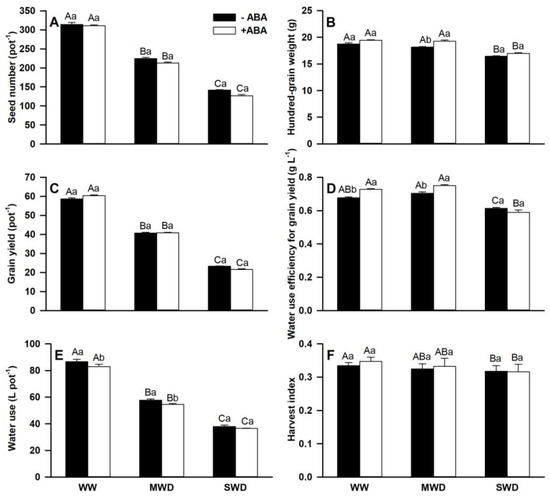 (A) Seed number (pot−1), (B) hundred-grain weight (g), (C) grain yield (pot−1), (D) water use efficiency for grain yield (g L−1), (E) water use (L pot−1) and (F) harvest index in the soybean cultivar Jindou 19 (JD)—with and without 10 µM exogenous ABA applied one day before withholding water—at 45 days after sowing (DAS) under three water treatments (well-watered (WW): Soil water content (SWC) maintained at 70–90% field capacity (FC); moderate water deficits (MWD): 45–55% FC and severe water deficits (SWD): 30–35% FC). Values are means ± SE (n = 7). The capital and small letter indicated significantly different among the water treatment at the same ABA level and between the ABA treatment at the same water treatment at p = 0.05, respectively.