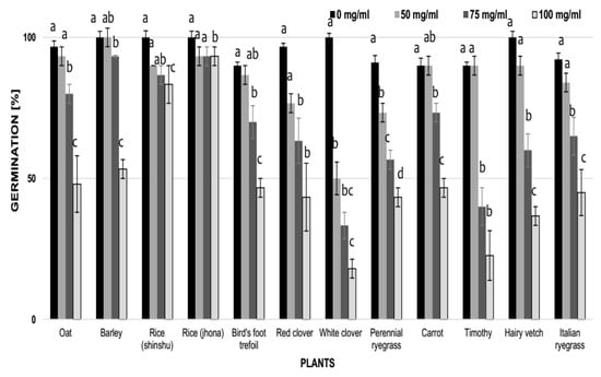 - Bogatek, R.; Gniazdowska, A.; Zakrzewska, W.; Oracz, K.; Gawroński, S.W. Allelopathic Effects of Sunflower Extracts on Mustard Seed Germination and Seedling Growth. Biol. Plant. 2006, 50, 156–158. [Google Scholar] [CrossRef]