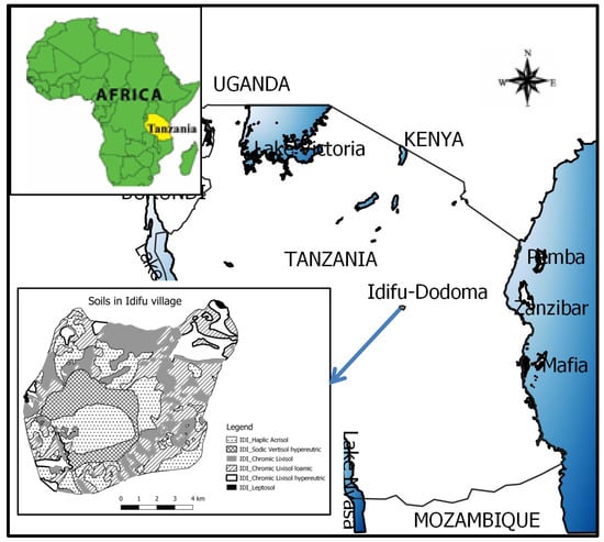 Experiments were conducted in Idifu village, Dodoma region, in central Tanzania (Figure 1) as a case study for SSA. Lying between latitudes 4°7″ and 7°21″ S and between longitudes 36°43″ and 35°5″ E, the region is a major producer of pearl millet. It has a semi-arid climate with a mean annual precipitation of 481 ± 183 mm (mean ± Standard Deviation (SD)), with an average temperature of 24 °C (data period 2010–2018). In the village, sandy soils dominate. They are found to contain a low total nitrogen (%) mean of 0.04 ± 0.02, mean pH (H2O) of 6.7 ± 0.9, and a low mean soil organic matter (%) of 0.74 ± 0.35 (mean ± S.D). As shown in Figure 1, soil groups (according to different groups of the World Reference Base (WRB) Soil Groups [25]) varied across the village.
