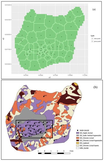Rain gauges distribution representing the experimental design in Idifu village (a) initial design (b) final design after considering access and farmers’ willingness (modified from [10]).