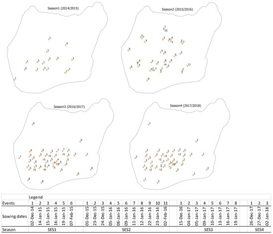 No spatial discrepancies in the onset of the rainy season existed for SES1, SES2, and SES4. Only SES3 exhibited a significant spatial variation of rain onset, ranging between 5 and 10 days. The average figures for inter-season cumulative rainfall during onset over the four seasons were 44.4 ± 8.5 mm, 40.6 ± 7.1, 11.7 ± 4.4 mm, and 11.5 ± 1.9 mm (mean ± SD) for SES1, SES2, SES3, and SES4 respectively. The average figures for seasonal spatial rainfall were 379.7 ± 19.8 mm (n = 17), 788.3 ± 22.0 mm (n = 36), 158.4 ± 24.8 mm (n = 45), 433.4 ± 42.2 mm (n = 45) (mean ± SD) for SES1, SES2, SES3, and SES4 respectively. The earliest onset was observed in SES2 (1 November, 2015), followed by SES1 (30 November 2014), SES3 (1 December, 2016) and SES4 (25 December, 2017). The planting dates (events) of farmers varied across space (Figure 3) and time. The average number of events per season was (7 ± 3), with planting dates differing regardless of the proximity between the fields (Figure 3). The highest number of events was 11 in SES2, while the three events in SES4 were the lowest. SES1 and SES3 demonstrated a difference of one day in terms of onset and their numbers of events were 6 and 8, respectively. Generally, events were concentrated between late December and January across all four seasons. Specifically, there were more events concentrated between 1 and 20 January, except for SES4, which exhibited an unusual trend which is explained by an excessive delay in seasonal onset. The divergence of first planting dates from onset ranged between 1 and 36 days. The divergence was small when the onset was late (SES4) and large when the onset was early.