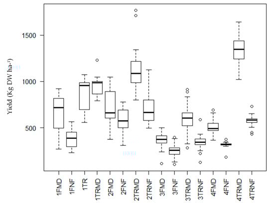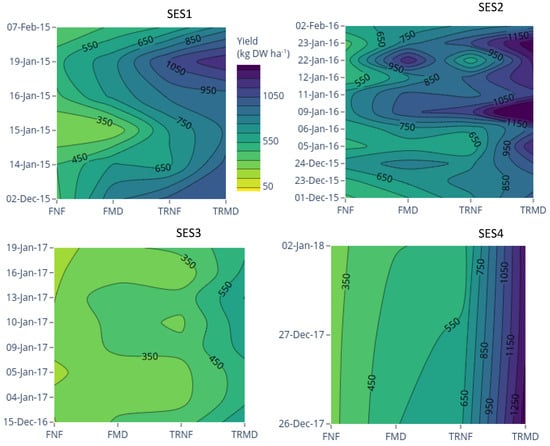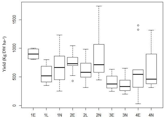 The farmers practiced early planting and normal planting more than late planting. As the onset for all four seasons occurred between November and late December, the planting dates reveal the preference of farmers to practice planting after onset in all seasons. Overall, the highest seasonal dry weight (DW) average yields were recorded in SES2 (782.9 kg DW ha−1) followed by SES1 (711.4 kg DW ha−1), and SES4 (682.0 kg DW ha−1); the lowest average seasonal yield was recorded in SES3 (392.68 kg DW ha−1) (Figure 4). Yields during SES1, SES2, and SES4 were not statistically different (p < 0.05) (Figure 5). Only SES3 was statistically significantly different from the rest (p < 0.01). A variability in seasonal rainfall was among the causes of discrepancies in average yield across the seasons, as noted in existing studies [10], however, the variable planting dates practiced by farmers were also a potential source of yield and WUE variations (Figure 4).