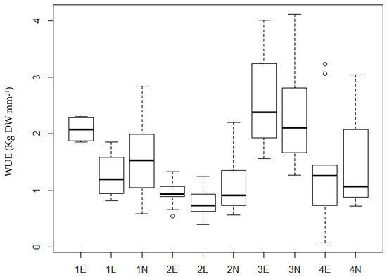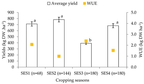SES2 recorded the highest yield values; however, it was the poorest season in terms of inter-season water use efficiency (1.00 kg DW mm−1) (Figure 5). Most of the seasonal rainfall was lost as runoff, deep percolation, or evaporation. The highest mean water use efficiency was in SES3 (2.39 kg DW mm−1), followed by SES1 (2.07 kg DW mm−1) and SES4 (1.53 kg DW mm−1) (Figure 5). The lowest average WUE values in SES2 indicate the importance of rainwater harvesting and its storage possibilities during seasons with excess rainfall.