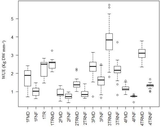 Similarly, the WUE was higher under TRMD in all seasons, with early planting recording higher values than normal or late season planting. The spatial average values for WUE were 2.07 ± 0.76 kg DW mm−1, 1.00 ± 0.28 kg DW mm−1, 2.39 ± 0.86 kg DW mm−1, and 1.53 ± 0.98 kg DW mm−1 for SES1, SES2, SES3 and SES4 respectively. SES3 recorded the highest WUE values followed by SES1, SES4 and SES2 (Figure 7). In SES2, the WUE in TRMD during the normal planting window was higher than the WUE for both early and late planting. The highest achieved value of WUE was 3.8 kg DW mm−1 (0.38 kg m−3) in SES3 under TRMD and the lowest recorded WUE was 0.53 kg DW mm−1 (0.05 kg m−3) in SES2 under FNF. In all seasons, TRMD improved the WUE with a greater effect as compared to other treatments (Figure 7). Early and normal planting produced higher values of WUE than late planting for SES1 and SES2.