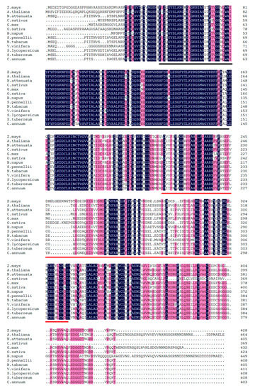 Multiple sequence alignment of the ZmBPM4/mab17 (Zea mays, ACG37150.1), AtBPM4 (Arabidopsis thaliana, NP_566212.2), NaBPM4 (Nicotiana attenuate, XP_019251977.1), CsBPM4 (Cucumis sativus, XP_011653454.1), GmBPM4 (Glycine max, XP_006604260.1), OsBPM4 (Oryza sativa, XP_015646533.1), BnBPM4 (Brassica napus, XP_013729393.1), SpBPM4 (Solanum pennellii, XP_015056619.1), NtBPM4 (Nicotiana tabacum, XP_016504598.1), VvBPM4 (Vitis vinifera, XP_002277148.1), SlBPM4 (Solanum lycopersicum, XP_004251235.1), StBPM4 (Solanum tuberosum, XP_006340346.1) and CaBPM4 (ACM67640.1) proteins. Dark-blue and gray-pink shading reflects 100% and 75% percent amino acid residues conservation, respectively. Gaps (-) were introduced to maximize alignment. A red solid line shows the Broad-complex Tramtrack and Bric-a-brac (BTB) domain, and a dark solid line shows the meprin and TRAF homology (MATH) domain.