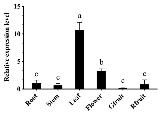 Real-time quantitative PCR was conducted to determine the expression of CaBPM4 in different tissues. CaBPM4 transcripts were detectable in all tissues, with leaf tissue having the highest expression level, which was about 10-fold higher than that of root tissue, followed by flower tissue, with the second highest level. Among other tissues, the expression levels were highest in roots followed by red fruit, stem, and green fruit tissues, respectively, but there was no significant difference between these tissues (Figure 3).