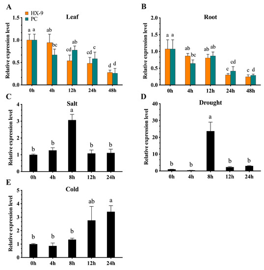 Expression profiles of CaBPM4 in response to P. capsici infection and abiotic stresses. (A) The avirulent PC strain (incompatible with the ‘A3’ pepper cultivar) and the virulent HX-9 strain (compatible with ‘A3’) of P. capsici infection in roots; (B) the avirulent PC strain (incompatible with the ‘A3’ pepper cultivar) and the virulent HX-9 strain (compatible with ‘A3’) of P. capsici infection in leaves; (C) salt stress; (D) drought stress; (E) cold stress. Relative expression levels of the CaBPM4 at different time point were determined in comparison with that in the control plants at the corresponding same time point. Results are presented as mean means ± SD of three independent biological replicates. Small letters (a–d) represent significant differences (p < 0.05).