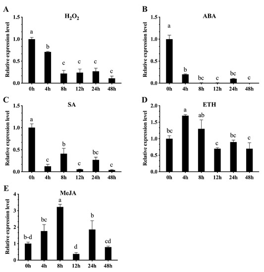 Quantitative real-time PCR analysis of CaBPM4 gene after signaling molecule treatments in the leaves of pepper plant. (A) Hydrogen peroxide (H2O2) treatment; (B) abscisic acid (ABA) treatment; (C) salicylic acid (SA) treatment; (D) ethephon (ETH) treatment; (E) methyl jasmonate (MeJA) treatment. Relative expression levels of the CaBPM4 at different time point were determined in comparison with that in the control plants at the corresponding same time point. Results are presented as mean means ± SD of three independent biological replicates. Small letters (a–d) represent significant differences (p < 0.05).