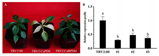 Effect of CaBPM4-silencing in pepper plant. (A) Phenotypes of CaBPM4-silenced, TRV2:00 (negative control) and TRV2:CaPDS (positive control, in which the endogenous phytoene desaturase (PDS) gene was silenced to cause photobleaching), and images were obtained after 35-days inoculation. (B) Real-Time RT-PCR analysis of CaBPM4 expression levels in TRV2:00 and CaBPM4-silenced line (#1, #2, and #3 indicate three biological levels of efficiency of CaBPM4 gene silencing) 35 days after inoculation. Relative expression levels of the CaBPM4 were determined in comparison with that in TRV2:00. Small letters (a, b) represent significant differences (p < 0.05).
