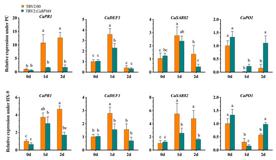 Silencing of CaBPM4 reduced the expression of defense defense-related genes in pepper at 1 day post-inoculation with PC and HX-9 strains of P. capsici. Relative expression levels of the defense defense-related genes at different time point under P. capsici infection were determined in comparison with that in TRV2:00. Values are the means ± SD from three independent experiments. Small letters (a–c) represent significant differences (p < 0.05).