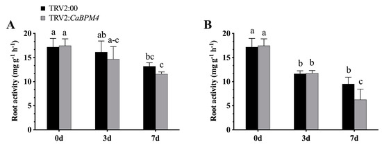 After inoculation with the PC strain of P. capsici, the expression levels of CaPR1, CaDEF1, CaPO1, and CaSAR82 were elevated. At 0 h, the expression of the pathogen-related genes CaPR1, CaDEF1, CaPO1, and CaSAR82 exhibited no significant difference between non-silenced plants and CaBPM4-silenced plants. Significant increases in the transcript abundances of CaPR1, CaDEF1, and CaSAR82 were detected at 24 h in the non-silenced plants, while the increase in the expression of defense-related genes was lower in the CaBPM4-silenced plants compared with control plants (Figure 7). However, CaPO1 expression was downregulated during P. capsici infection of both CaBPM4-silenced and control plants. At 2 day post-PC inoculation, CaDEF1 and CaSAR82 showed downregulation compared with that at 1 day, and significant difference were detected in the expression level of CaSAR82 between the control plants and CaBPM4-silenced plants. The expression of CaPO1 increased at 2 day, with a significant high level in the CaBPM4-silenced plants. Similarly, after inoculation with the HX-9 strain, the expression levels of the defense-related genes CaPR1, CaDEF1, and CaSAR82 were also upregulated 1 day post-inoculation. The up-regulation of CaDEF1 and CaSAR82 was significantly higher in non-silenced plants than in CaBPM4-silenced plants, while CaPO1 was downregulated at 1 day, followed by an increase at 2 day post-HX-9 inoculation. Furthermore, after P. capsici inoculation, we measured root activity in the silenced and control plants using the TTC method. Root activity in the silenced plants was lower than that in control plants, and in the case of the HX-9 strain, a significant difference was observed at 7 day post-inoculation between silenced and control plants (Figure 8).