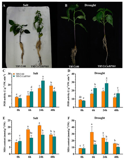 Physiological attributes of CaBPM4-silenced and control pepper plants under salt and drought stress. (A) Phenotypes of the gene-silenced plants in response to salt stress; (B) phenotypes of the gene-silenced plants in response to drought stress; (C) the activity of POD after salt stress; (D) the activity of POD after drought stress; (E) MDA concentration after salt stress; (F) MDA concentration after drought stress. Values are the means ± SD from three independent experiments. Small letters (a–e) represent significant differences (p < 0.05).