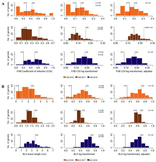 All phenotypic data were corrected for environmental variability (trial effect) using the MIXED procedure in SAS 9.3.1, following Sallam et al. [44]. Obtained best linear unbiased estimates (BLUEs) were adjusted for trial effects. In order to improve the normality of data distribution, BLUEs were transformed using arcsine-square root (arcsine√ 1 − (CI + 1)/100), log (log10 (CI + 1)), and square root ((√ (CI + 1)/100)) methods. Improved normality of the transformed data was assessed using the Shapiro-Wilk normality test (shapiro.test function) in R. Despite the test results confirming improved normality, transformed data still departed from normality except for FHB17 and BLS17 (Table S2). Based on the Shapiro-Wilk normality test, log-transformed datasets were best overall and used in all subsequent analyses. Broad-sense heritability (H) of the two diseases was estimated on a genet mean basis [29].