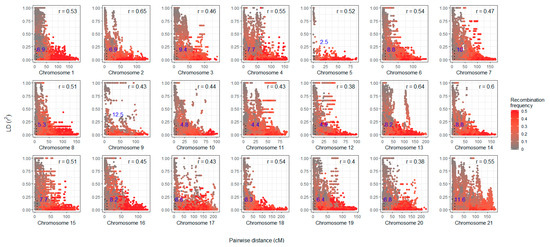 Pairwise linkage disequilibrium (r2) and recombination frequencies among SNP markers in each chromosome in the IWG F1 mapping population A77-3 × C20-7. X-axis shows the pairwise SNP distances in centiMorgans (cM), Y-axis shows the r2 values, and the legend shows distribution of recombination frequency values. Correlation coefficient between r2 and recombination frequency, r, is shown on the top right of each plot. Blue text shows the decay distance when r2 = 0.2.