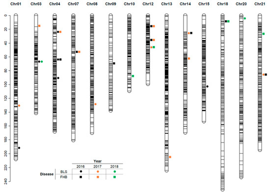 Interval mapping detected 22 QTL distributed in 14 chromosomes that provide resistance against BLS and FHB (Table 3, Figure 4). QTL have been named according to conventions used in wheat [46]. Across the three experimental years, 11 QTL were discovered for resistance against BLS and 15 against FHB. The lowest number of QTL (2) was detected in the BLS18 environment and the highest (8) was detected in the FHB16 environment. Five QTL were shared between the diseases (Figure 4):
