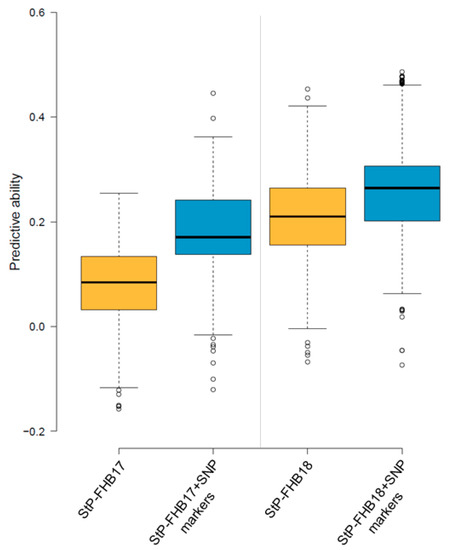 Predictive ability of Fusarium head blight (FHB) estimated by the ridge regression model in rrBLUP. SNP markers associated with FHB resistance in this study were used as fixed effects in the model to predict trait data collected in St. Paul, MN in 2017 (StP-FHB17) and 2018 (StP-FHB18). Each boxplot represents 1000 data points, i.e., correlations between the predicted trait value and actual trait value observed in the field obtained from 1000 independent runs.