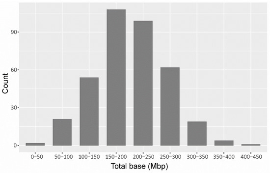 A total of 443.54 million raw paired-end reads were generated with paired-end sequencing on Hi-seq2000 for the 372 individuals, including the two parents.The raw reads were separated according to the sixbp-barcodes associated with each sample, resulting in the retention of 440.46 million reads (99.30%), showing a high efficiency and uniform library preparation and sequencing. The bases ranged from 49.76 Mb to 443.50 Mb among the 370 F2 lines, while the bases of the two parents (535.30 Mb for the female parent and 373.30 Mb for the male parent) (Figure 1; Table S1).