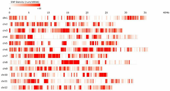 A total of 47,609 SNPs wereidentified as being homozygous and polymorphic amongthe two parents, segregating normally within the F2 population and representing an average of 7.48 kb/SNP. The SNP numbers on each chromosome varied from 2930 on chr01 to 6715 on chr06, and showed a weak positive non-significant correlation with physical length (r = 0.187). The average SNP distribution among the 12 pseudochromosomes ranged from 4.76 kb/SNP on chr07 to 12.11 kb/SNP on chr01 (Figure 2; Table 2). An average of 26.06 SNPs existed in each progeny line and an average of 0.36 SNPs existed in eachgene.