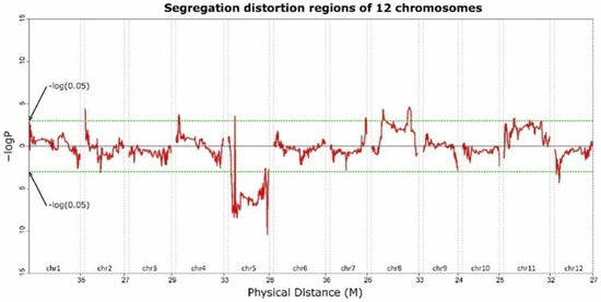 Distortion regions of the 12 chromosomes. The values above or below the black horizontal line indicate positive (male parent) and negative (female parent) segregation distortion, respectively.