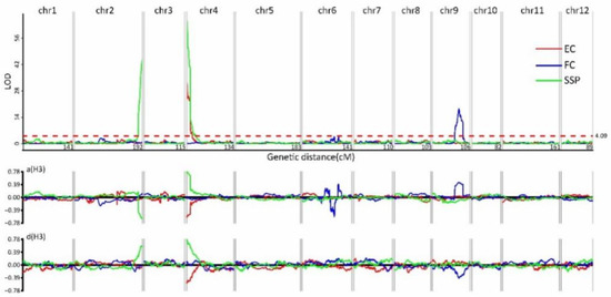 Quantitative trait locus (QTL) analysis of exocarp color (EC), flesh color (FC), and skin spotting (SSP). Upper graph: The x-axis shows the 12 groups and linkage distance; the y-axis shows the logarithm of odds (LOD) values. The LOD threshold was >2.5. Lower graph: The x-axis shows the 12 groups; the y-axis shows additive values.