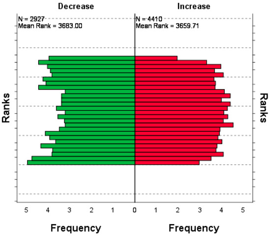 Showing the differences in the mean ranks of increase and decrease in areas of invasion between the two climate scenarios.