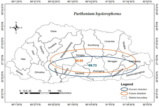 The directional distribution in the current climatic scenario (blue ellipse) followed angles of rotation from 87.06° to 89.73° northeast and 92.22° to 92.88° southeast, while in the future (orange ellipse) it followed from 78.74° to 89.99° northeast and 90.41° to 93.04° southeast (see Supplementary Material Figure S3). The directional distribution of A. conyzoides became almost a perfect circle in the future climatic scenario, which according to the algorithm of standard deviational ellipse represents a dispersion in distribution. There was also a notable northward shift in the distribution of P. hysterophorus from the current to the future scenario as seen in Figure 3. Such observations are in accordance with the findings that climate change can disrupt species distributional patterns [64,77,78,79,80] by the process of colonization and removal of local species through competition.
