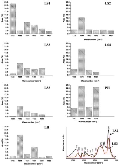 The relative area percentage gave an estimation of the functional group distribution in the Hs (Figure 1). The band at around 1640 cm−1 showed a variable distribution among products. For instance, it was dominant in LS1 (24%), LH (18%), LS2 (13%), and totally absent in LS5. The aromatic structure was diversified into different bands at around 1580, 1559, and 1500 cm−1. The first band was dominant in LS4 (21%), LS3 (9.4%), and LH (9.0%), and absent in PH. In the other products, this band ranged from 8% to 2.4%. The second band at 1559 cm−1 accounted for 24% in PH and 9% in LS1. The last band at around 1500 cm−1 was prevalent in PH (7.5%), LS1 (7%), and LS3 (5%). In other lignosulfonates, it varied from 4% in LS4 and LS5, 2.5% in LS2, and 1% in LH. Finally, the band at 1371 cm−1 accounted for 23% in the commercial humate PH.