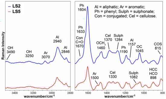 The Raman spectra of LS2 and LS5 are reported in Figure 2, while the complete attributions of the two lignosulfonates are shown in Table 2. Both spectra display bands at 3490 and 3250 cm−1, attributable to OH stretching free or H-bonded, respectively, and both aliphatic (at 2940 and 2846 cm−1) and aromatic (at 3070 cm−1) CH stretching in the higher wavenumber region. Moreover, the shoulder at about 1670 cm−1 could be ascribed to conjugated C=O stretching [], the bands at 1630, 1604, and about 1500 cm−1, together with that one at 1190 cm−1, were all attributable to phenolic rings, the last one specifically to lignin [,]. The peaks at 1460, 1370, and 1330 cm−1 corresponded to bending vibrations of O-CH3, CH, and aliphatic OH in lignin and cellulose, respectively []. The peaks at 1284 and 1082 cm−1, together with that recorded at 815 cm−1 indicated the presence of sulfated groups [,]. Other bands observed in the Raman spectra were less indicative to identify the functional groups present in LS2 and LS5. The relative intensity of the over reported bands is different in the two examined spectra. In particular, for LS5 the bands attributable to aromatic groups (at 3070, 1633, 1604, and 1190 cm−1) displayed a higher intensity compared to LS2, indicating that the aromatic component was higher in LS5. On the contrary, the bands at 1330 and 898 cm−1, both attributable to cellulose, were more intense in LS2, indicating a higher content of this component in LS2 compared to LS5.