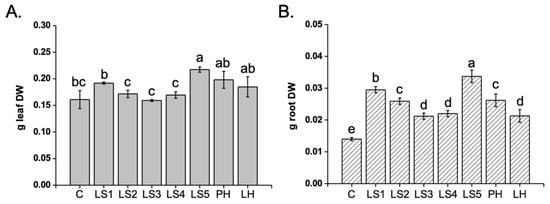 The effect of Hs application on maize plant growth is reported in Figure 3. Results indicated that LS5 was the most effective in promoting the leaf (Figure 3A) and root (Figure 3B) dry weight (+140% and +35%, respectively), compared to the untreated plants. The remaining Hs did not substantially improve the leaf biomass produced by plants. However, they all stimulated the root growth appreciably. Specifically, LS3, LS4, and LH increased the root biomass of plants by 51%, 57% and 52%, respectively, while LS2 and PH were by about 85%, and LS1 was by 111%.