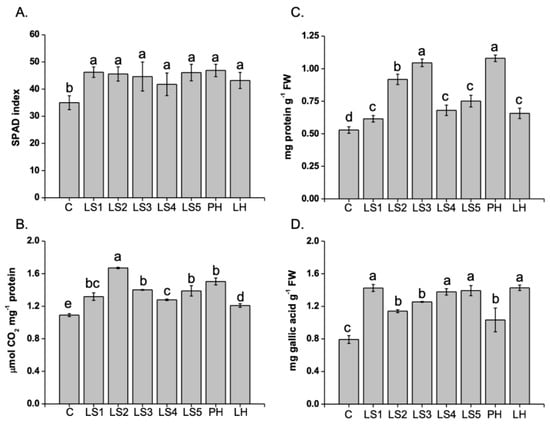 Effect of humates (Hs) on SPAD index (A), RuBisCO activity (B), protein content (C), and total phenolic compounds (D) in leaves of Z. mays L. plants. Twelve-day-old plants were supplied with Hs at 1 mg C L−1 for two days. Different letters above bars indicate significant differences at p < 0.05, according to Student–Newman–Keuls test. Data represent the means of three measurements with three plants in each (±SD). C = control; LH = commercial lignosulfonate-based product; PH = commercial humate extracted from leonardite; LS1-LS5= specialty lignosulfonates.