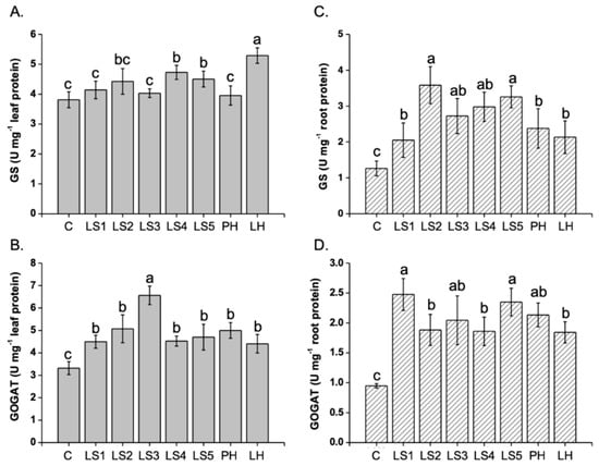 Effect of humates (Hs) on glutamine synthetase (GS) and glutamate synthase (GOGAT) activity in leaves (A, B, respectively) and roots (C, D, respectively) of Z. mays L. plants. Twelve-day-old plants were supplied with Hs at 1 mg C L−1 for two days. Different letters above bars indicate significant differences at p < 0.05, according to the Student–Newman–Keuls test. Data represent the means of three measurements with three plants in each (±SD). C = control; LH = commercial lignosulfonate-based product; PH = commercial humate extracted from leonardite; LS1 − LS5 = specialty lignosulfonates.