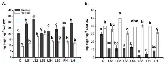 Effect of individual humates (Hs) on glucose and fructose accumulation in leaves (A) and roots (B) of Z. mays L. plants. Twelve-day-old plants were supplied with Hs at 1 mg C L−1 for two days. Different letters above bars (un-bolded for glucose and bolded for fructose) indicate significant differences at p < 0.05, according to the Student–Newman–Keuls test. Data represent the means of three measurements with three plants in each (±SD). C = control; LH = commercial lignosulfonate-based product; PH = commercial humate extracted from leonardite; LS1 − LS5 = specialty lignosulfonates.