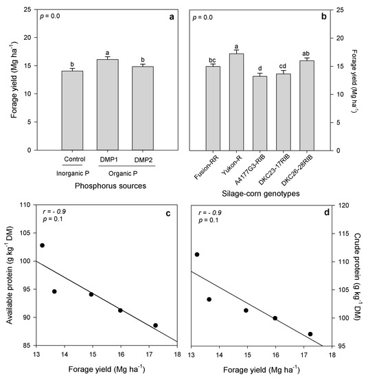 Effects of inorganic and organic phosphorus amendments on forage yield (a). Variation in forage production among silage-corn genotypes (b). Pearson’s correlation showing the association between forage yield and available protein (c) and crude protein (d) among five silage corn genotypes. Each bar represents mean of three replications ± SE.
